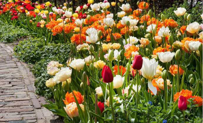 Nádherná záplava farieb. Pri tvorbe podobnej výsadby je potrebné cibulky optimálne nahustiť. Pri riedkej výsadbe by výsledný efekt mohol stratiť čaro hustého farebného porastu.
