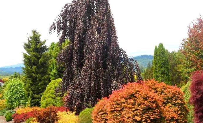 Hlavným ťažiskom daného záhonu je Javor mliečny ´Royal red´ . Listy tejto odrody sú sýto vínové, až hnedočierne, lesklé a na jeseň sa menia na jantárovú až ohnivo oranžovú.